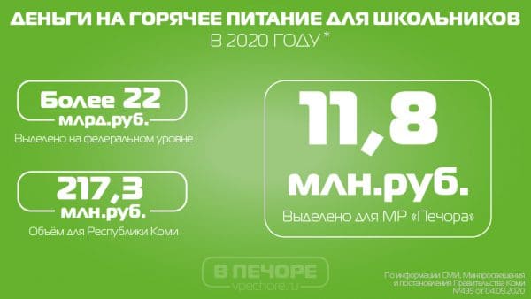 - 11 миллионов рублей на бесплатное питание для школьников: https://vpechore.ru/2020/09/05/besplatnoe-pitanie-shkolnikov-2020/