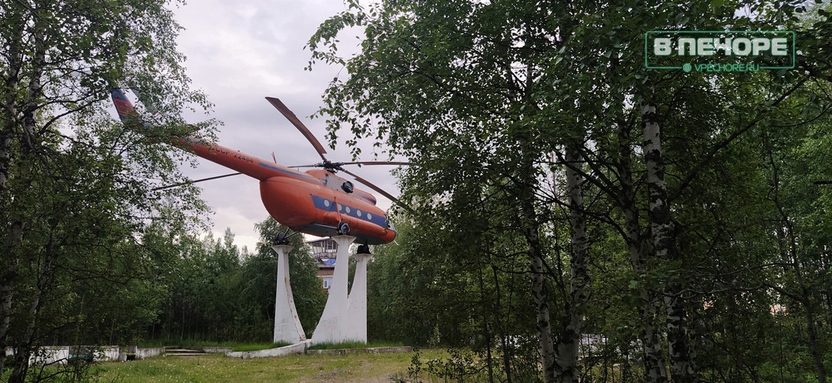 Такой вертолёт под управлением А.А. Травина был выпущен до города Усинска на “вечную стоянку”. Такой же памятник-вертолёт решено было поставить и в Печоре. Задумал его Виктор Савин, работавший в то время командиром авиапредприятия. Вертолёт должен был стать памятником авиаторам, осваивающим Север на винтокрылых машинах. И, хотя первыми вертолётами в Печоре были Ми-4 и Ка-18, как памятник в 1984 году был установлен вертолёт Ми-8, потому что старых машин уже не осталось. Получился обобщённый памятник авиаторам Печоры. Чертёж постамента выполнил сам В.Г. Савин. Изготавливали и устанавливали: Н. Струков и Липатов.