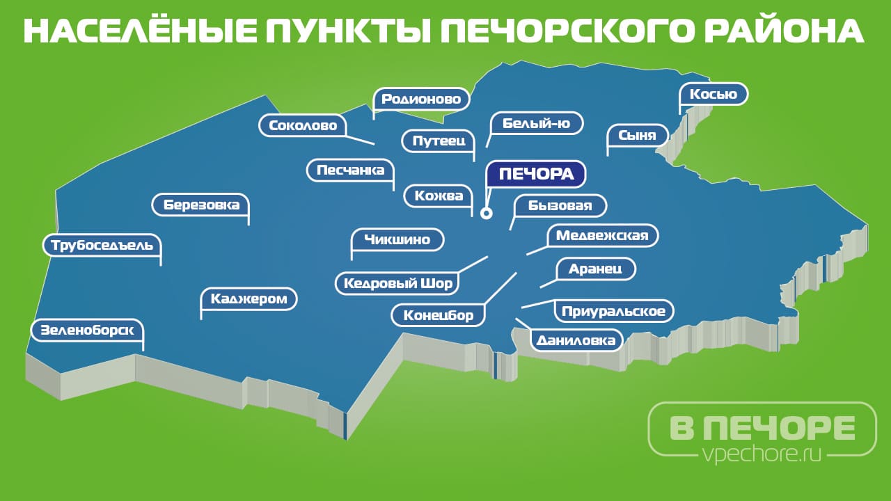 На территории района помимо города Печора расположены 6 административных территорий: 2 посёлка городского типа и 4 сельских поселения. К каждой административной территории отнесены несколько населённых пунктов.